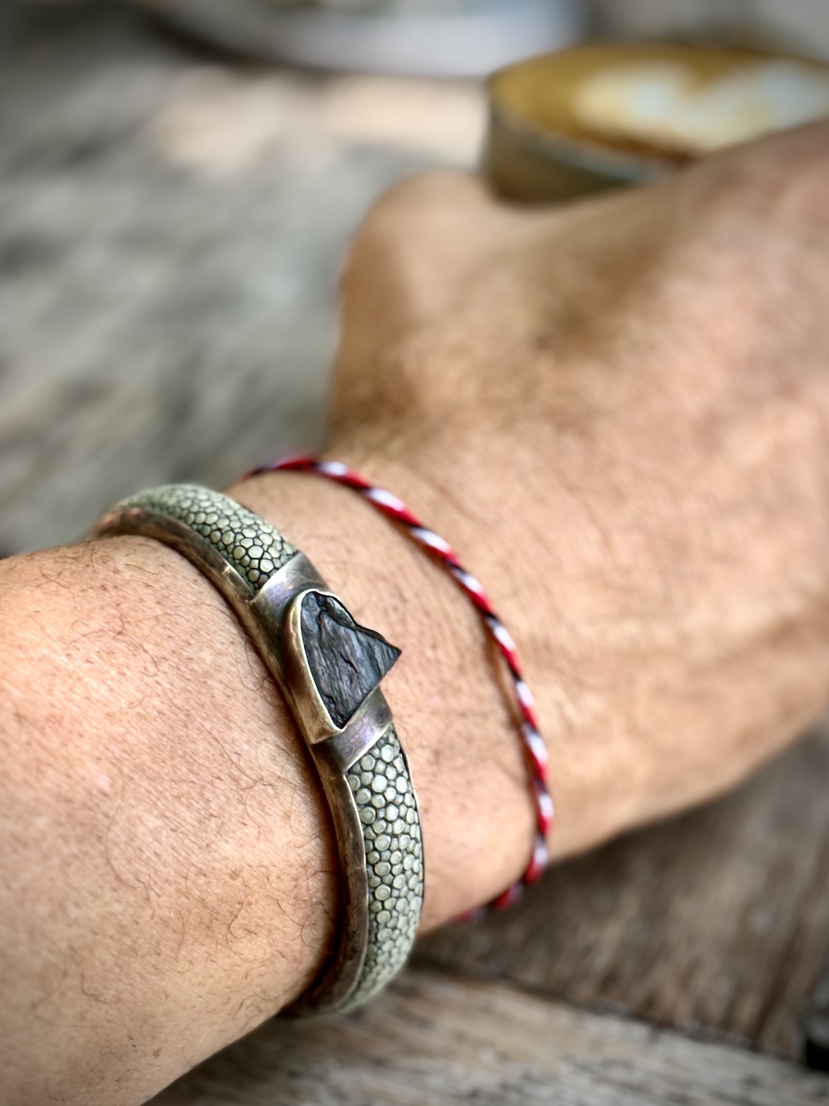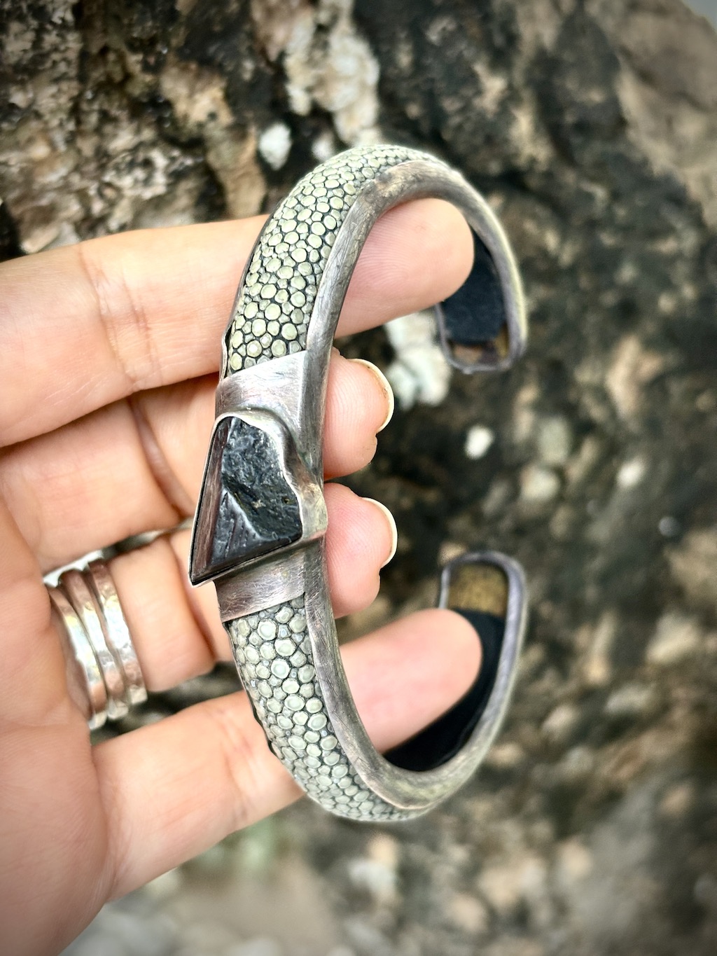 This unique bangle is meticulously crafted from 925 silver and adorned with rugged natural stingray skin. It has rustic style design that adds a touch of bold sophistication to any ensemble, while the crystal accent completes the look with a dash of elegance. Embrace timeless craftsmanship and rugged charm with this one-of-a-kind accessory.